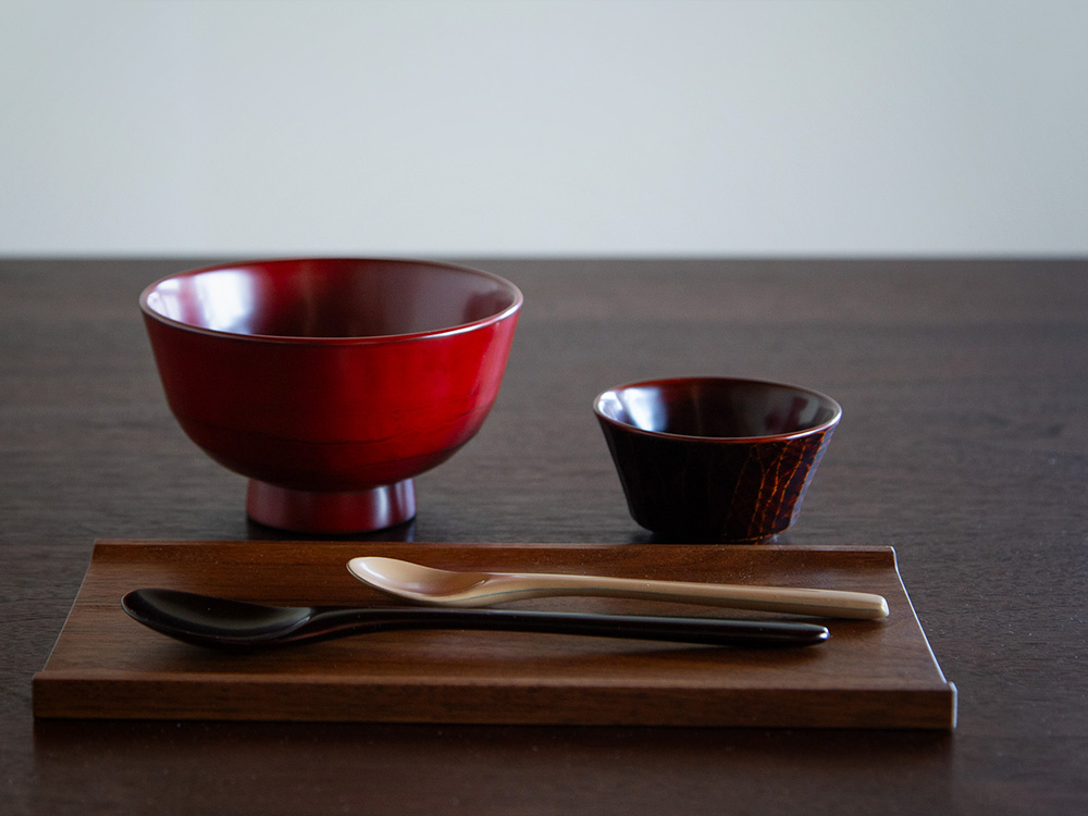 作家自身が作った椀や皿や弁当箱に、作家自身が漆を塗って仕上げた作品たち。